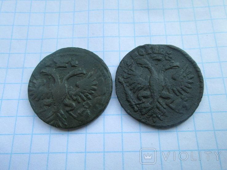 Недавний проход двух монет деньга, перечеканов, со слабыми следами от копейки Петра Алексеевича, выпуска Красного монетного двора, 1731 года, Монеты из земли. Самый распространенный 3-й и 4-й шаблоны реверса. Со старта в 1 гривну, через 30 ставок, достигла финишной цены в 250 грн. Проход на украинском аукционе 21.08.2025 года. Фото прилагаю.