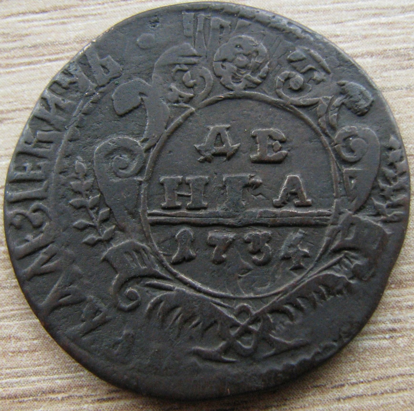 Доброго вечера. :) Благодарю. ;) Интересный поздний перечекан 1734 года с хорошими следами от легенды копейки Петра Алексеевича. :hi: С уважением.
