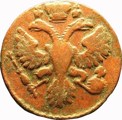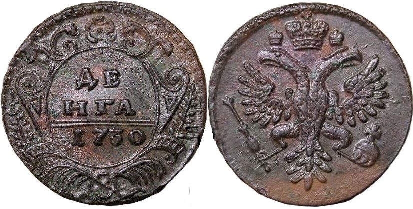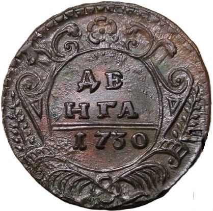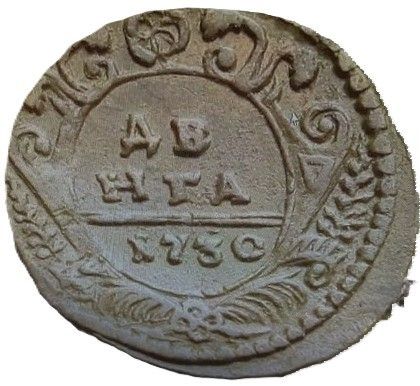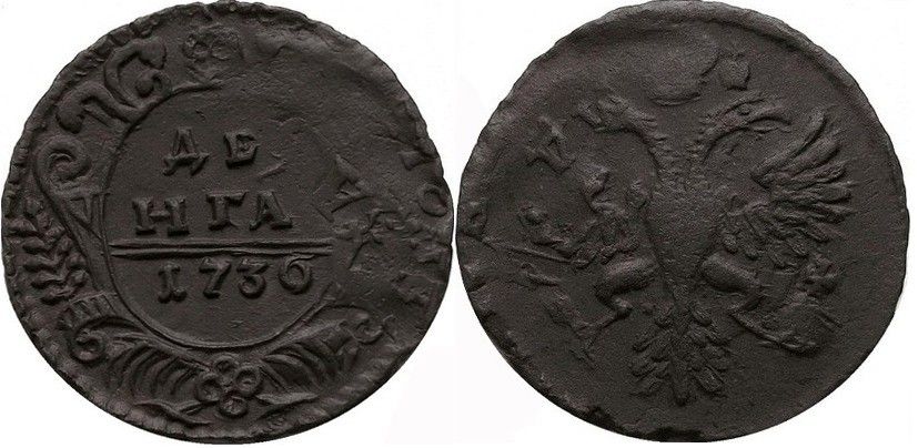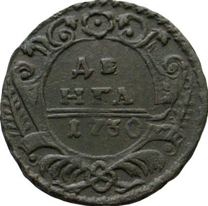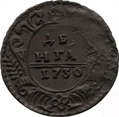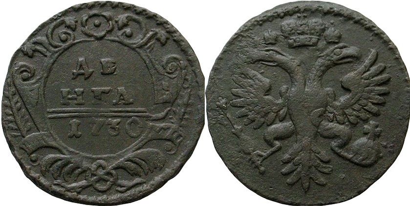 39г. Аверс: орёл образца 1730 г. Корона открытого типа. В крыльях по 9 и 10 перьев. Хвост по три ряда перьев с каждой стороны. Крест державы простой. Навершие скипетра в форме трилистника.