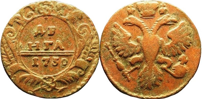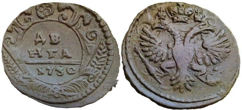 41. Аверс: орёл образца 1730 г. Корона закрытого типа. В крыльях по 9 и 10 перьев, с остями. Хвост по три ряда перьев с каждой стороны. Крест державы простой. Малые короны без крестов. Навершие скипетра в форме трилистника.