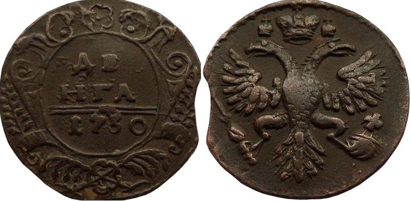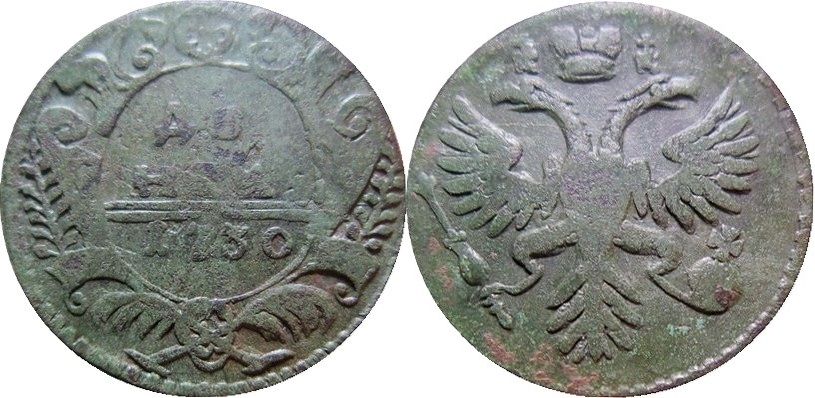 39а. Аверс: орёл образца 1730 г. Корона открытого типа. В крыльях по 9 и 10 перьев. Хвост по три ряда перьев с каждой стороны. Крест державы простой. Навершие скипетра в форме трилистника.