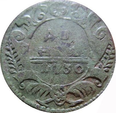 Реверс: шаблон №2. Розетка 5 лепестковая, образца 1730 года, 7 группа (ГК). В лавровых ветвях по 11 листьев. С перевязью бантом пальмовых ветвей. Интересно набита цифра «0» в дате (двумя скобками).