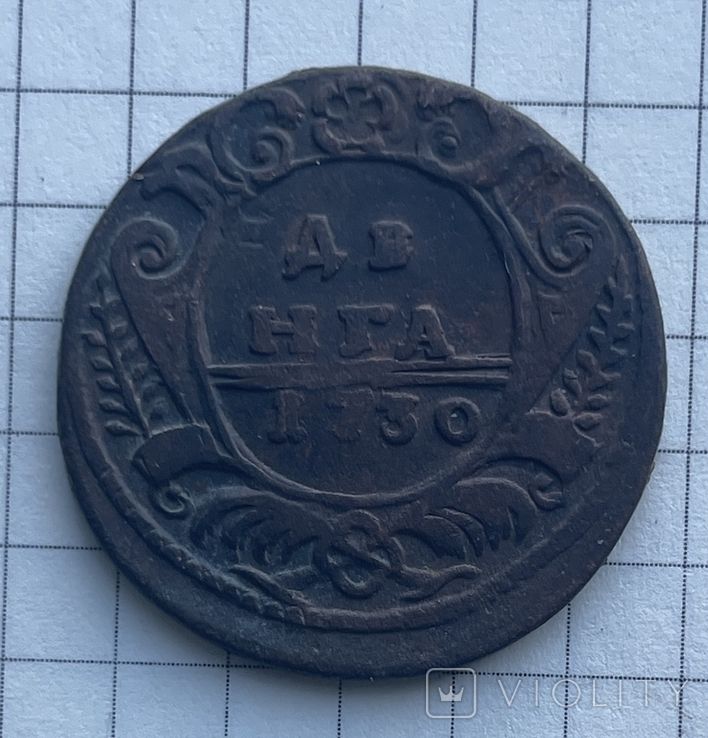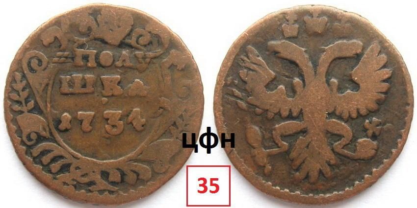 Руководство ЦФН классифицирует эту разновидность деньги следующим образом: 35 - аверс: орёл образца 1730г., крест державы простой, хвост орла – три пера с одной стороны и два с другой, реверс: внешаблонный, розетка образца 1731г., боковые ветви по семь листочков с каждой стороны, надпись номинала и года нанесены с большим перекосом, монета встречается реже.