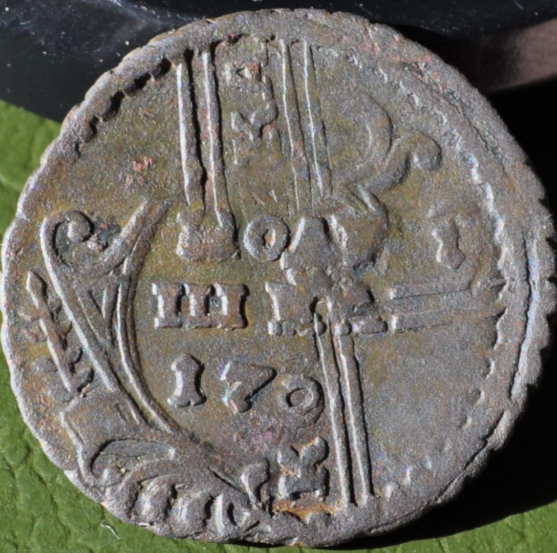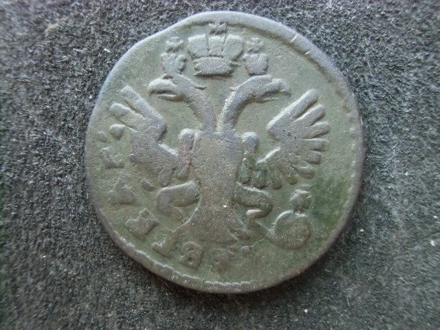 Интересный поздний перечекан полушки 1735 года из "крестовой" копейки Петра II, с явными следами от даты предыдущей монеты. Фото прилагаю.