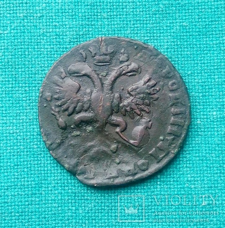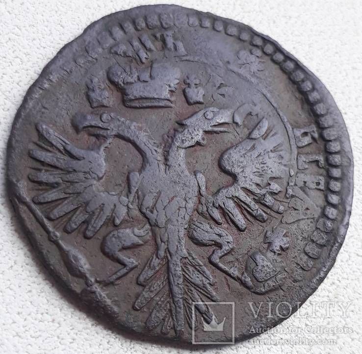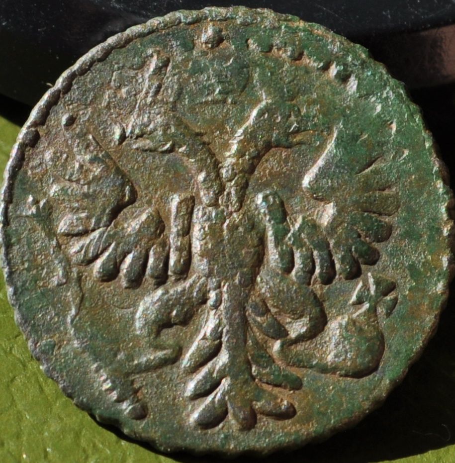 Перечекан деньги 1730 года "Бородатый" орел, из копейки Петра Алексеевича, с явными следами.