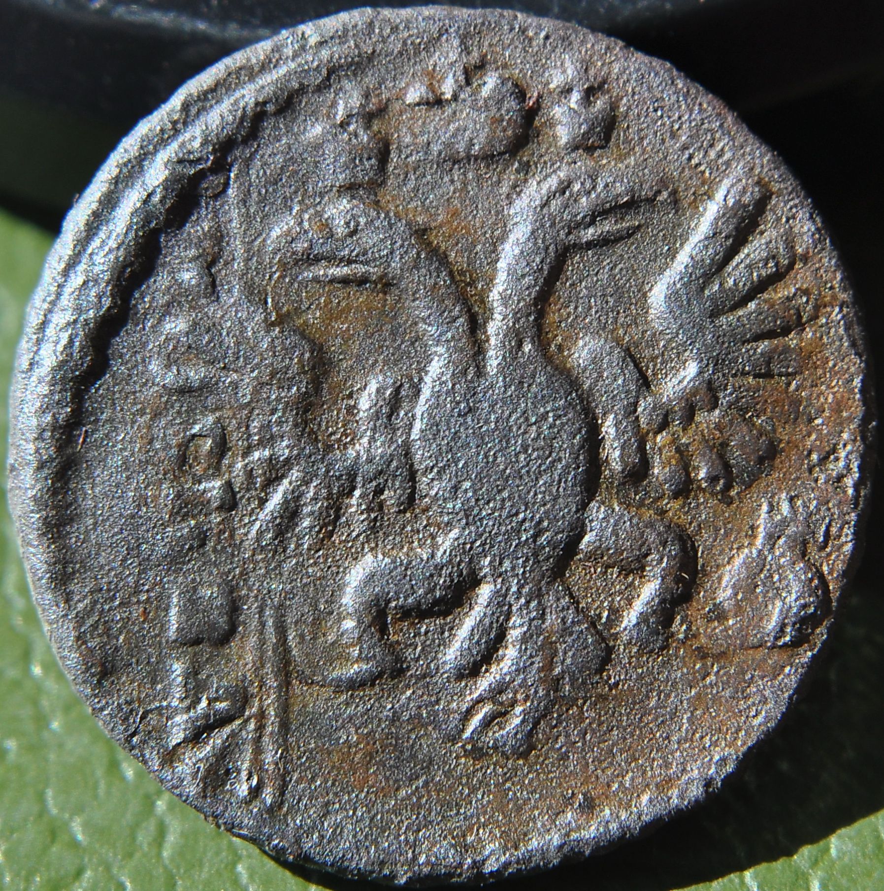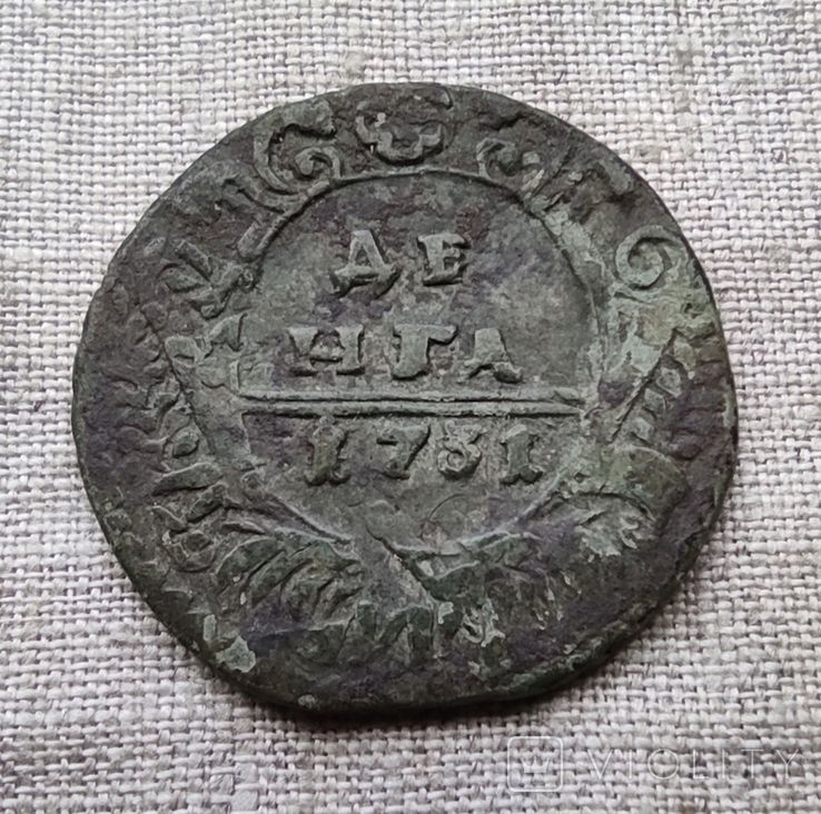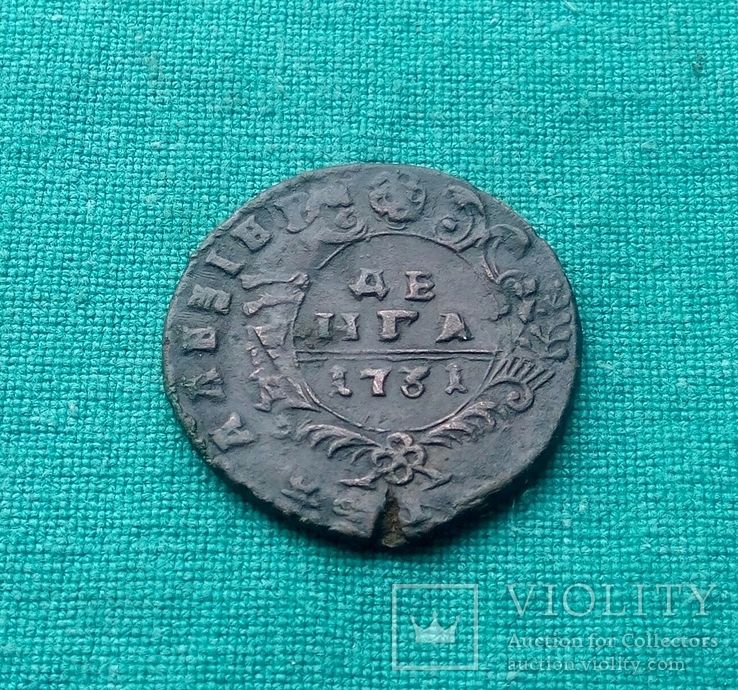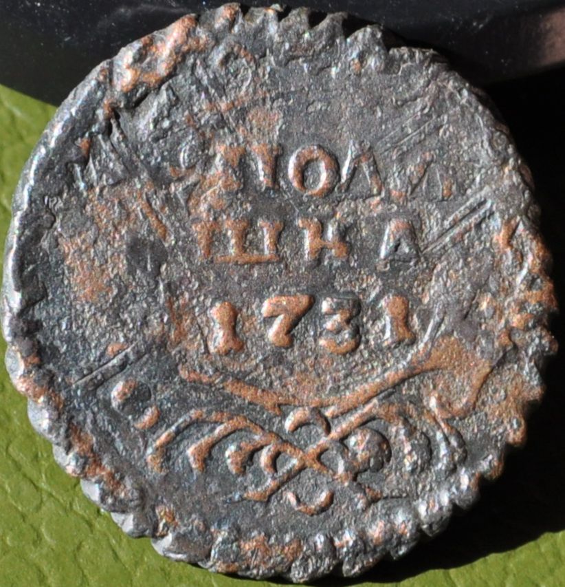 Перечекан деньги 1731 года из копейки Петра Алексеевича, с явными следами.