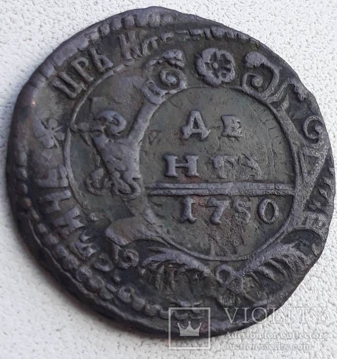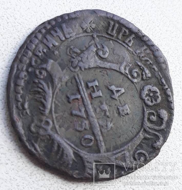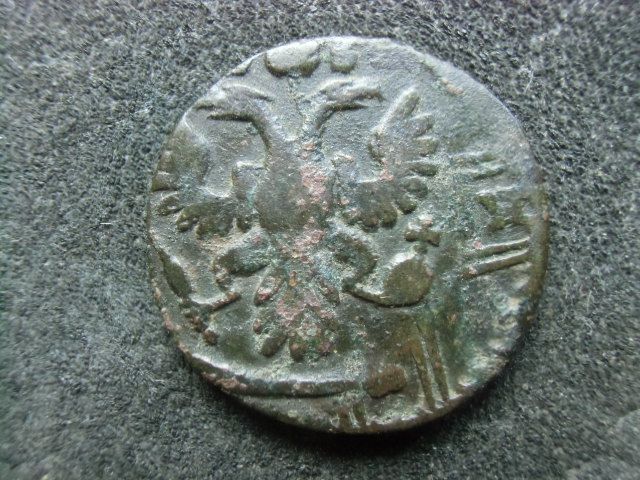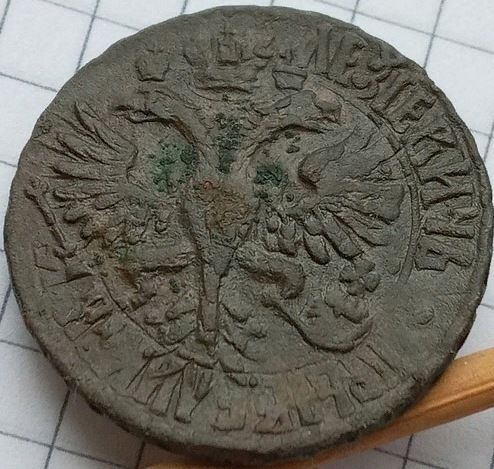 Перечекан деньги 1734 года из копейки Петра Алексеевича, с явными следами.