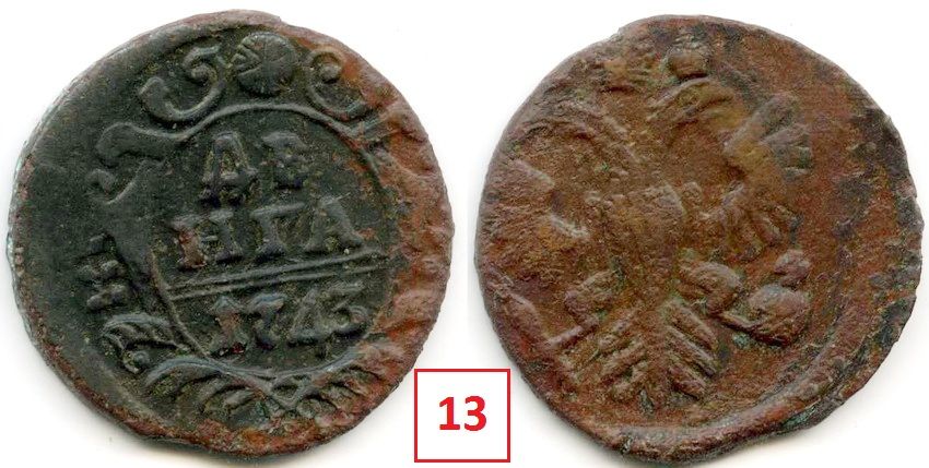 Тогда в этот же №35 просится фото монеты 1743 года, нашего уважаемого коллеги Андрея (aries777), реверс без передатировки, в отличии от ЦФН №12, где аверс одноштемпельный, а реверс с передатировкой. ;) С уважением.