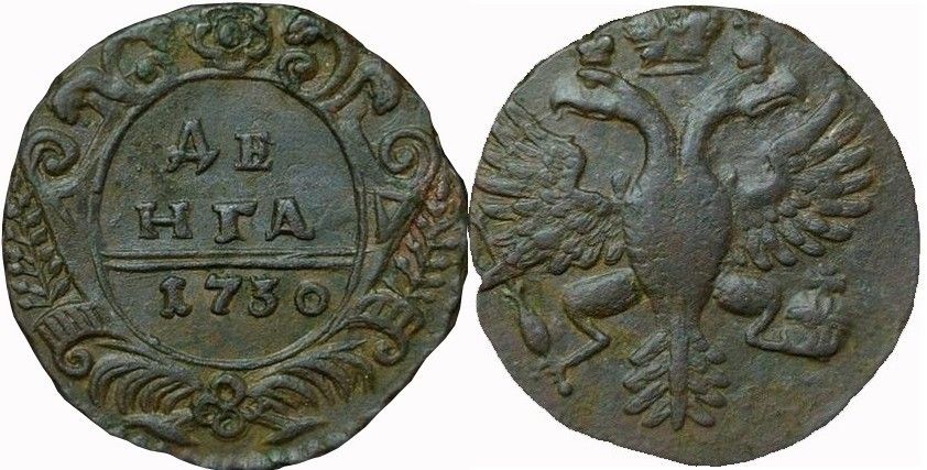 В продолжение темы Орлов. Деньга 1730 года. Малый и Толстый Орлы, они же Малыш и Толстяк.