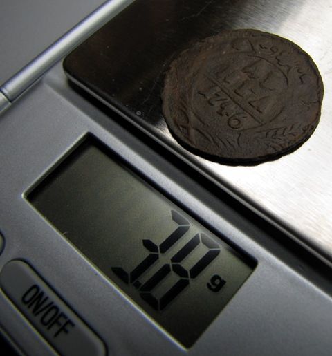 Доброго вечера. :) Рекордсменка в перевесе 1746 года среди деньги выпуска Красного монетного двора с весом в 10,63 гр., который составляет 129,79%, от установленного среднего веса для деньги в 8,19 гр. Взвешивание проводилось на лабораторных весах. :hi: С уважением.