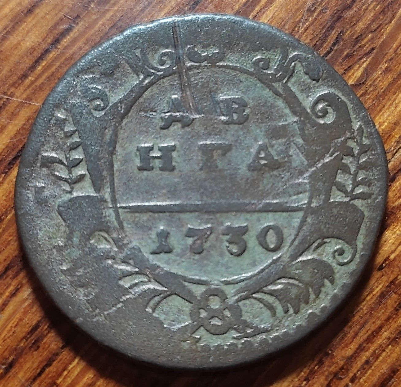 Одно из последних приобретений,- деньга 1730 года, относящаяся к разновидности по Руководству ЦФН №36, но одноштемпельная только по аверсу. Здесь же хочу сказать спасибо нашему уважаемому коллеге aries777, за помощь в приобретении этой монеты.