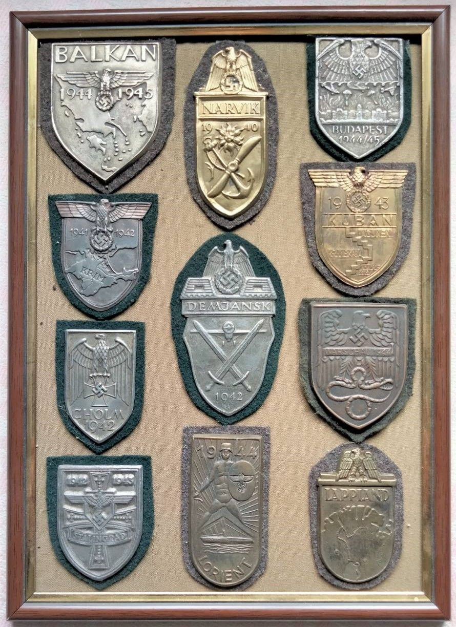 Рамка з нагородними нарукавними щитами 3-го Райху. Частина з них була випущена і відбулось офіційне нагородження - Нарвік, Крим, Кубань, Холм, Дем"янськ.