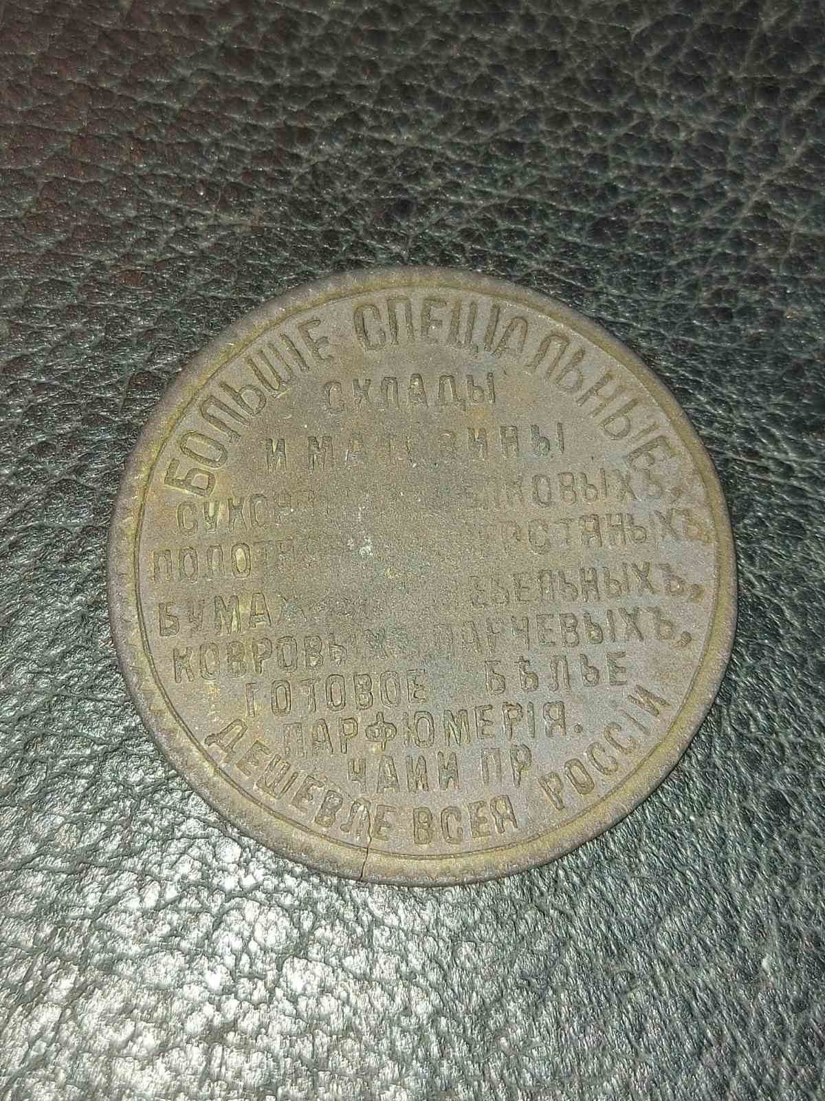 Погуглив також, знайшов, це рекламний жетон магазину офіцерських і церковних речей (на зворотній стороні зображені свічник, потир).