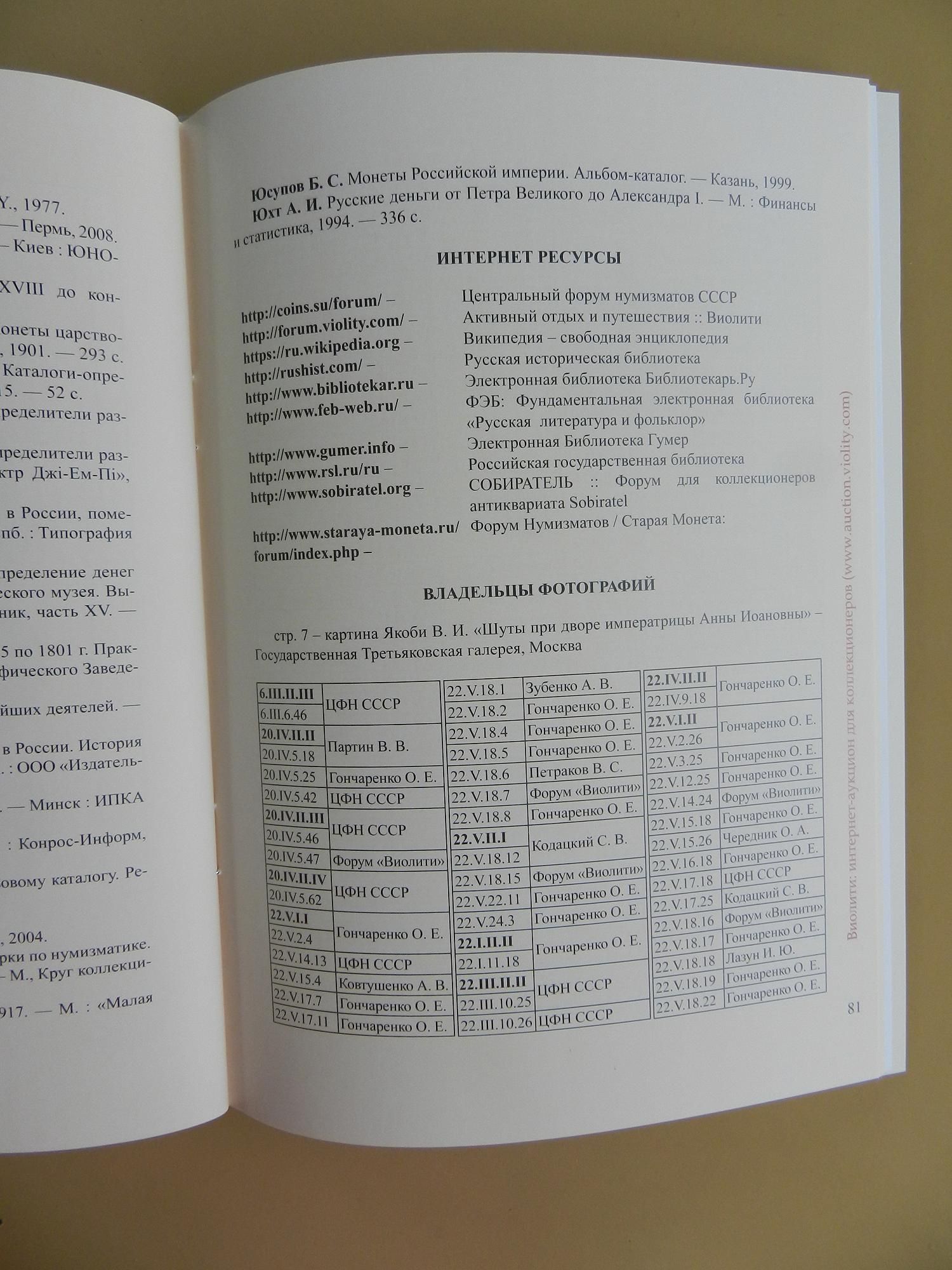 В книге представлена разработанная авторами систематизация и классификация деньги 1735 г. по типам и вариантам штемпелей. Для каждого типа и варианта дано краткое описание реверса и аверса, каталожный номер, авторская оценка стоимости, а также представлена цветная фотография монеты.