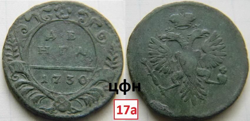 6. Денга 1730 года 4-хлепестковая розетка 1730 ЦФН №18