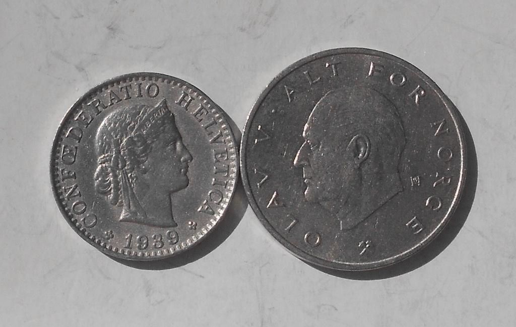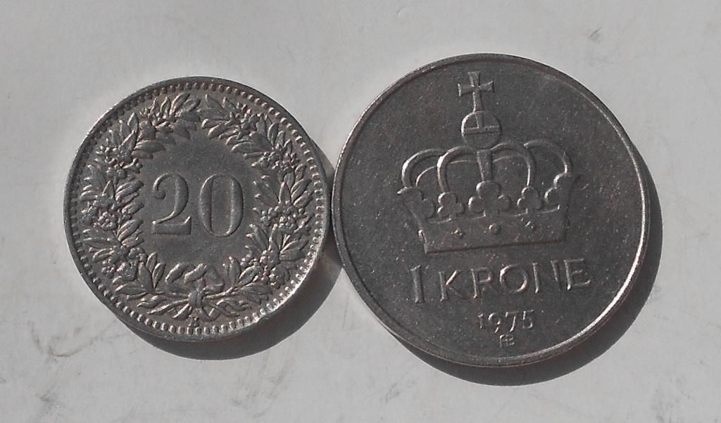 Швейцарія 20 рапен 1939 р., Новегія 1 крона 1975 р.