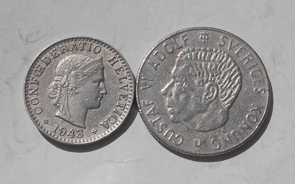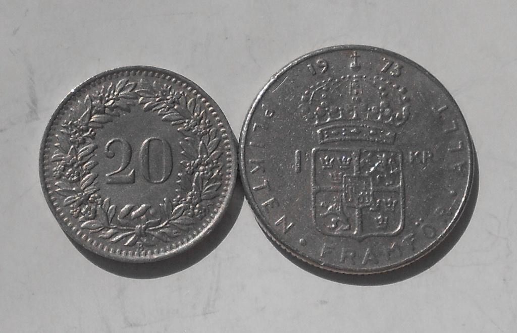 Швейцарія 20 рапен 1943 р., Швеція 1 крона 1973 р.