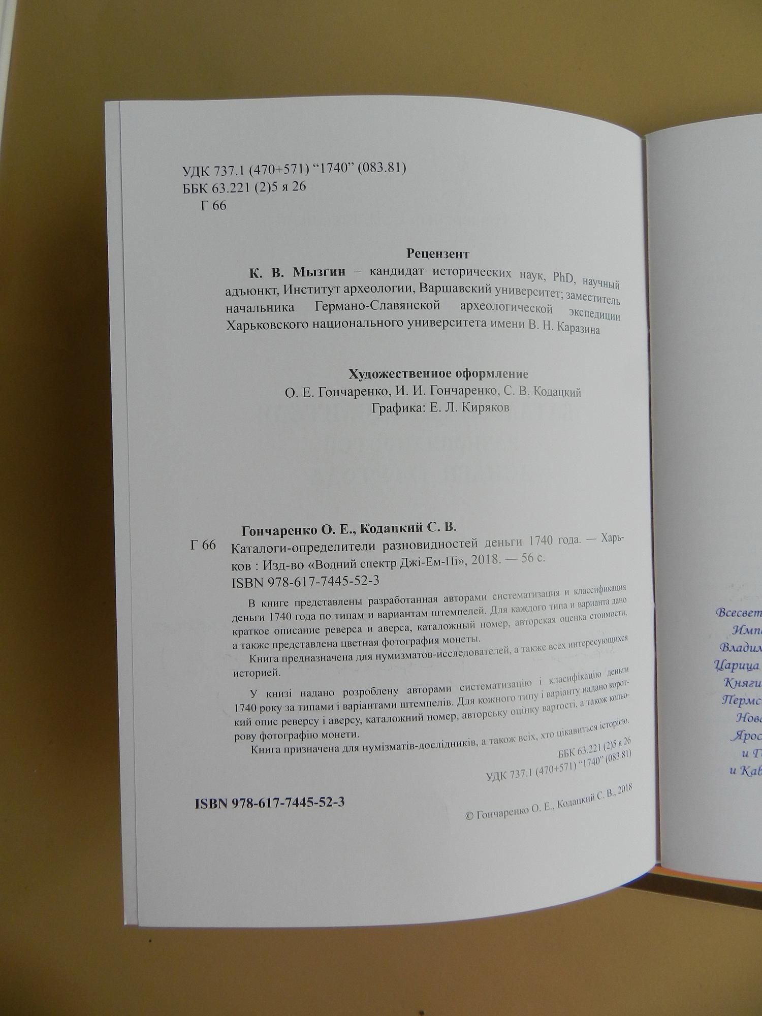 В книге представлена разработанная авторами систематизация и классификация деньги 1739 г. по типам и вариантам штемпелей. Для каждого типа и варианта дано краткое описание реверса и аверса, каталожный номер, авторская оценка стоимости, а также представлена цветная фотография монеты.
