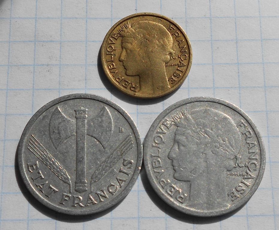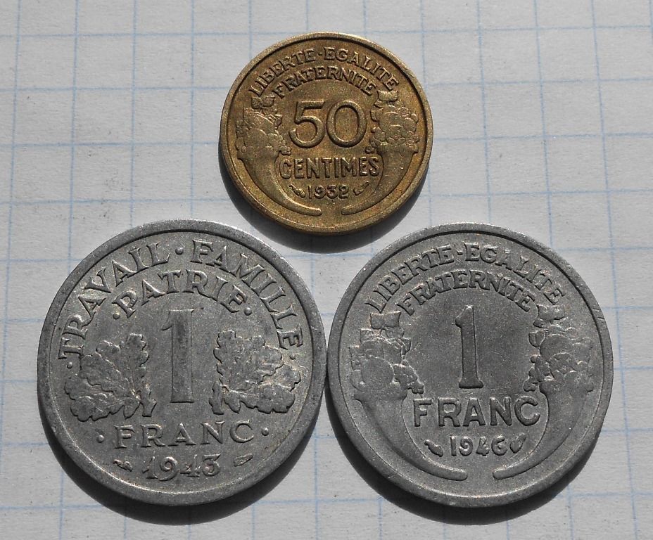 Франція 50 сантимів 1932 р., 1 франк 1943 р., 1 франк 1946 р.