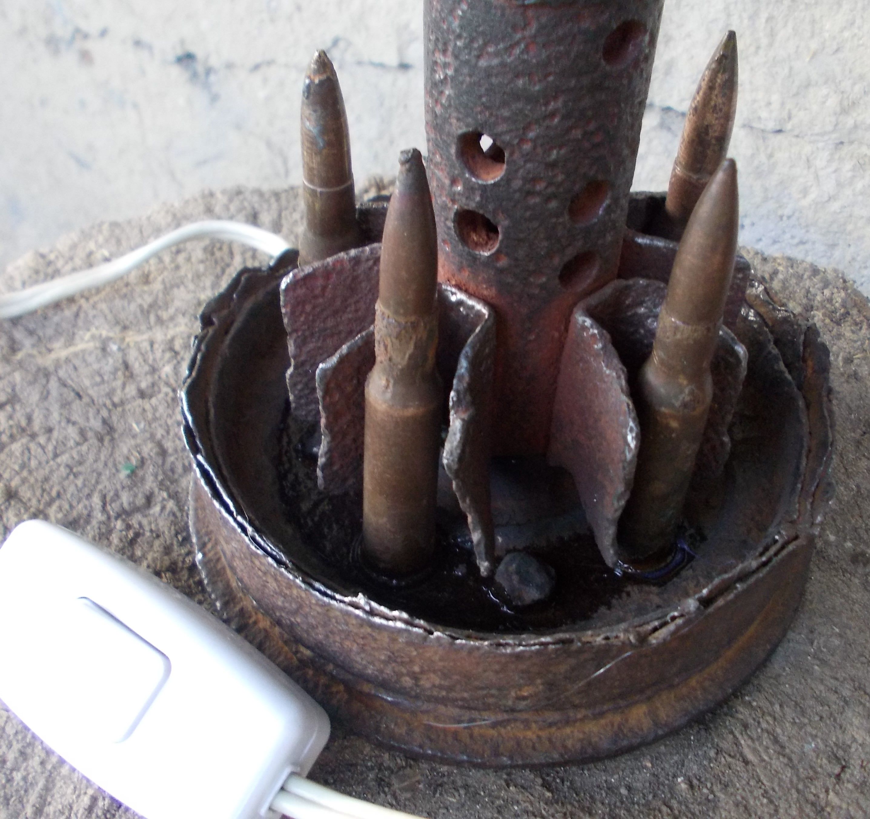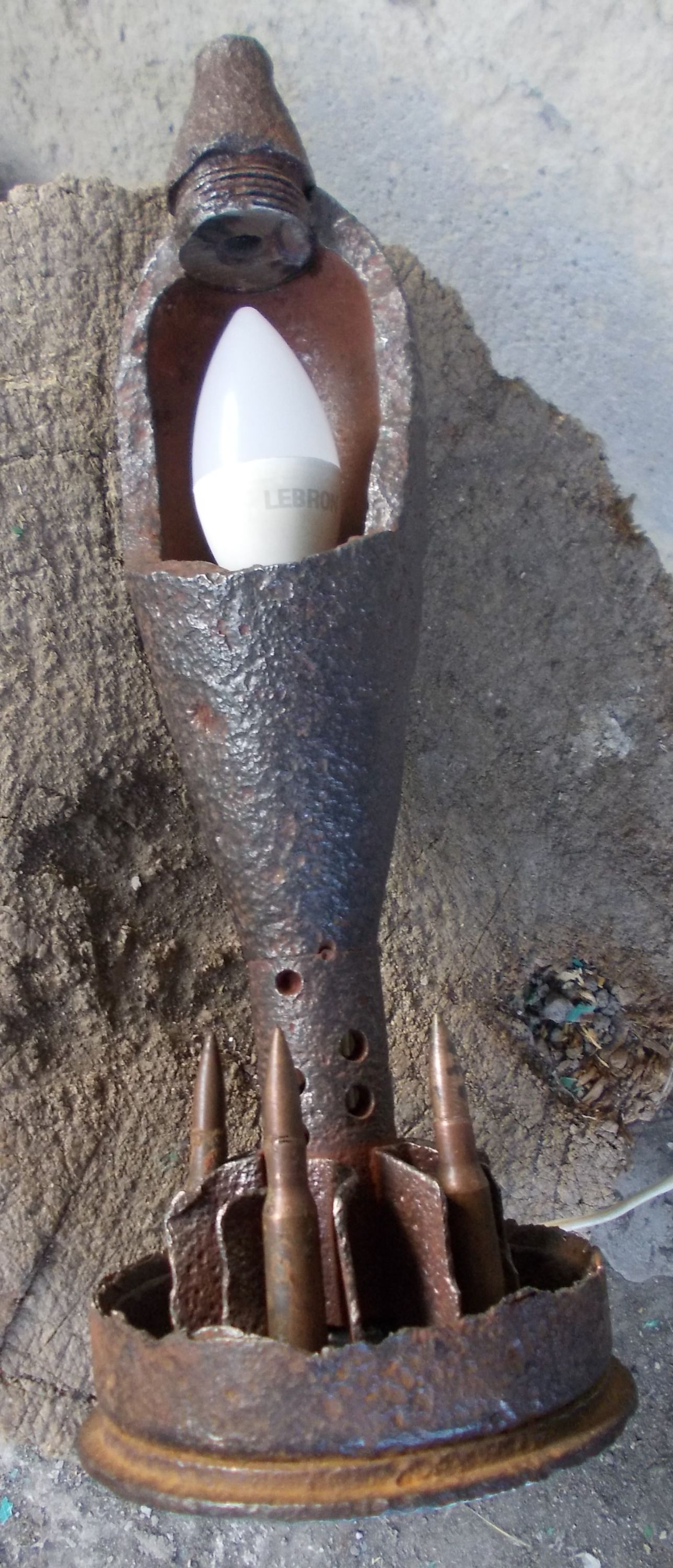 Почну з себе, зробив лампу-міну-світильник. Давно виношував ідею, шукав підходящу для задумки розірвану мінку. Знайшов. Платформа - приварене до хвостовика міни донце гансючої арт гільзи 105 мм. Міна - совітська 80 мм. Малий цоколь лампочки. Між перами стабілізатора приклеїв макети патрів мосінок. Не фарбував і не буду, так має красивий антуражний вигляд.