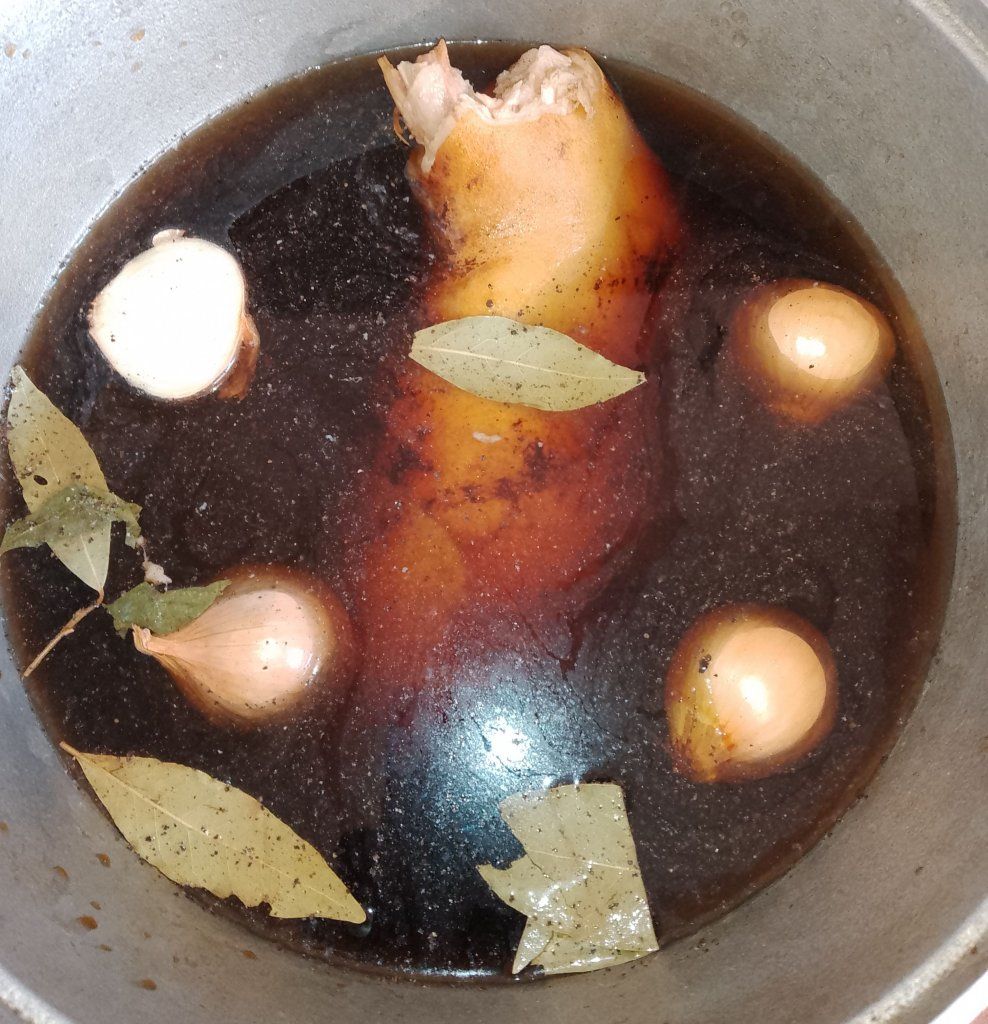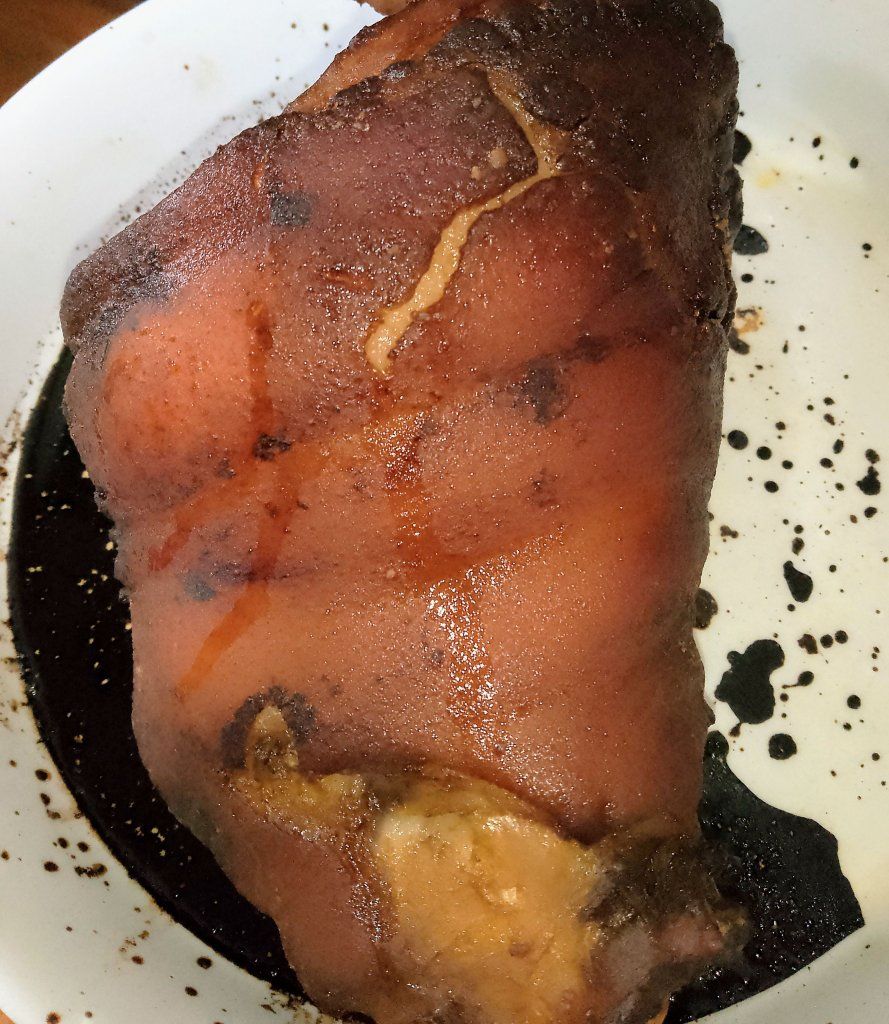 Рулька звісно що домашню заливаємо темним пивом, бажано розливним крафтовим, і в пиві лишаємо на ніч. Потім добавляємо цибулю (не чистимо, ріжемо навпіл), перець душистмй та чорний горошком, лавровий листок, сіль. Варимо 2 години на повільному вогні. Далі убираємо з вогню та залишити доки не охолоне. Поки охолоняє, в соєвому соусі розчиняємо мед та гірчицю, і цим маринадом мастимо рульку і в духовку на 40 хвилин. Мінус один, швидко улітає).