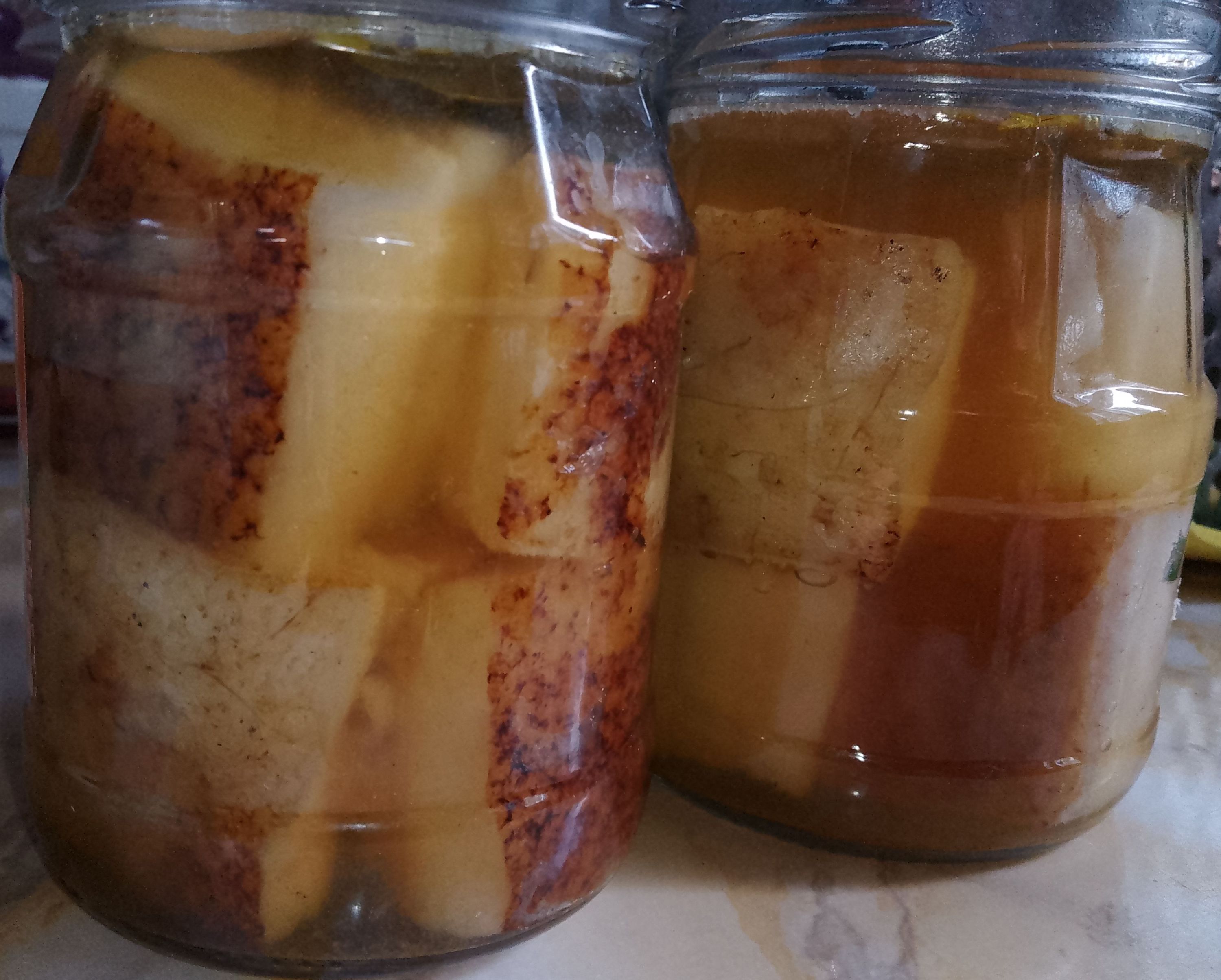 Коропа ріжемо на рівні куски і кладемо шарами, шар риби добре посолити, шар, посолити. Далі під гніт і на дві доби. Потім рибу добре промиваємо та вимочуємо у холодній воді хвилин 30. Далі в посудину кладемо шар риби, порізана цибуля та трохи суміш перців, і так шарами. Потім в смажену пахучу олію добавляємо трохи уксусу, перемішуємо і заливаємо рибу. Через годину можна вживати, краще з картоплею в мундирі).
