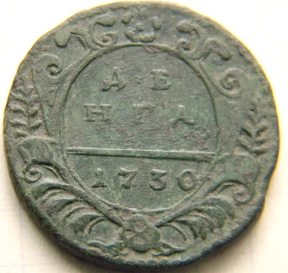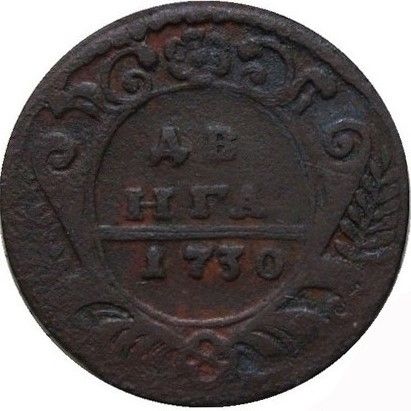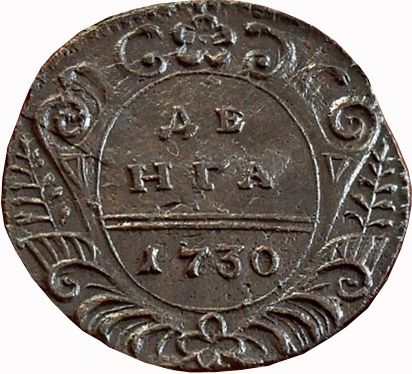 2. Аверс: орел с языками, образца 1730 г., внешаблонный, малого размера, детально проработанный (он же: "малый орёл"). Корона открытого типа. В крыльях по 8 перьев, с остями. Хвост по три ряда перьев с каждой стороны, с остями. Крест державы узорный. Навершие скипетра в форме трилистника. Малые короны без крестов (ТЦ с №1).