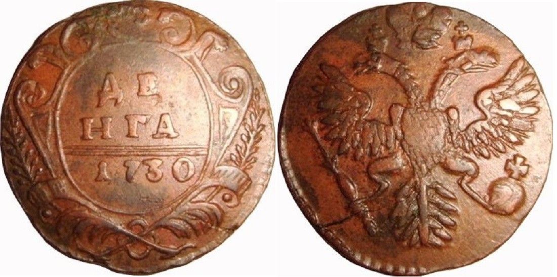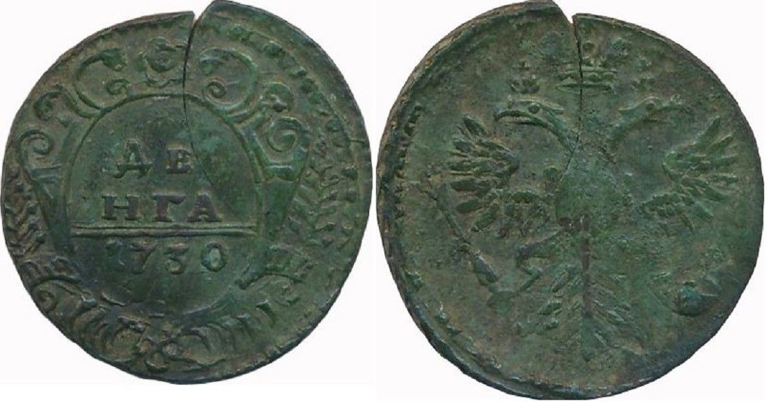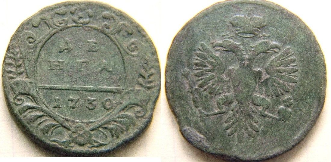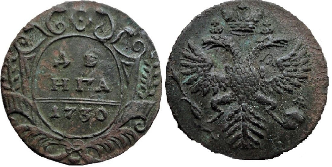 1734. Денги неизвестного Московского двора и временного двора Площильной мельницы на реке Яузе