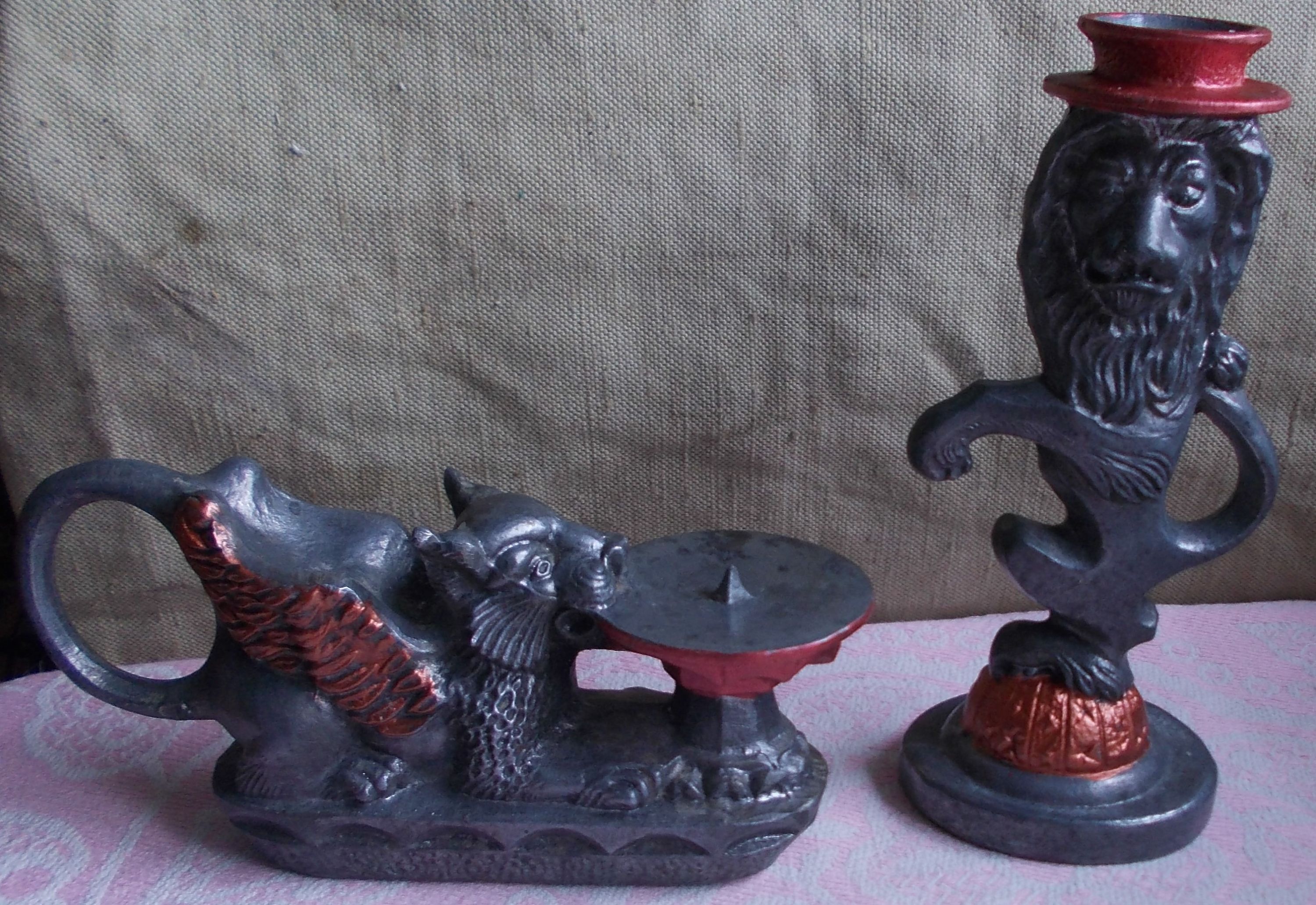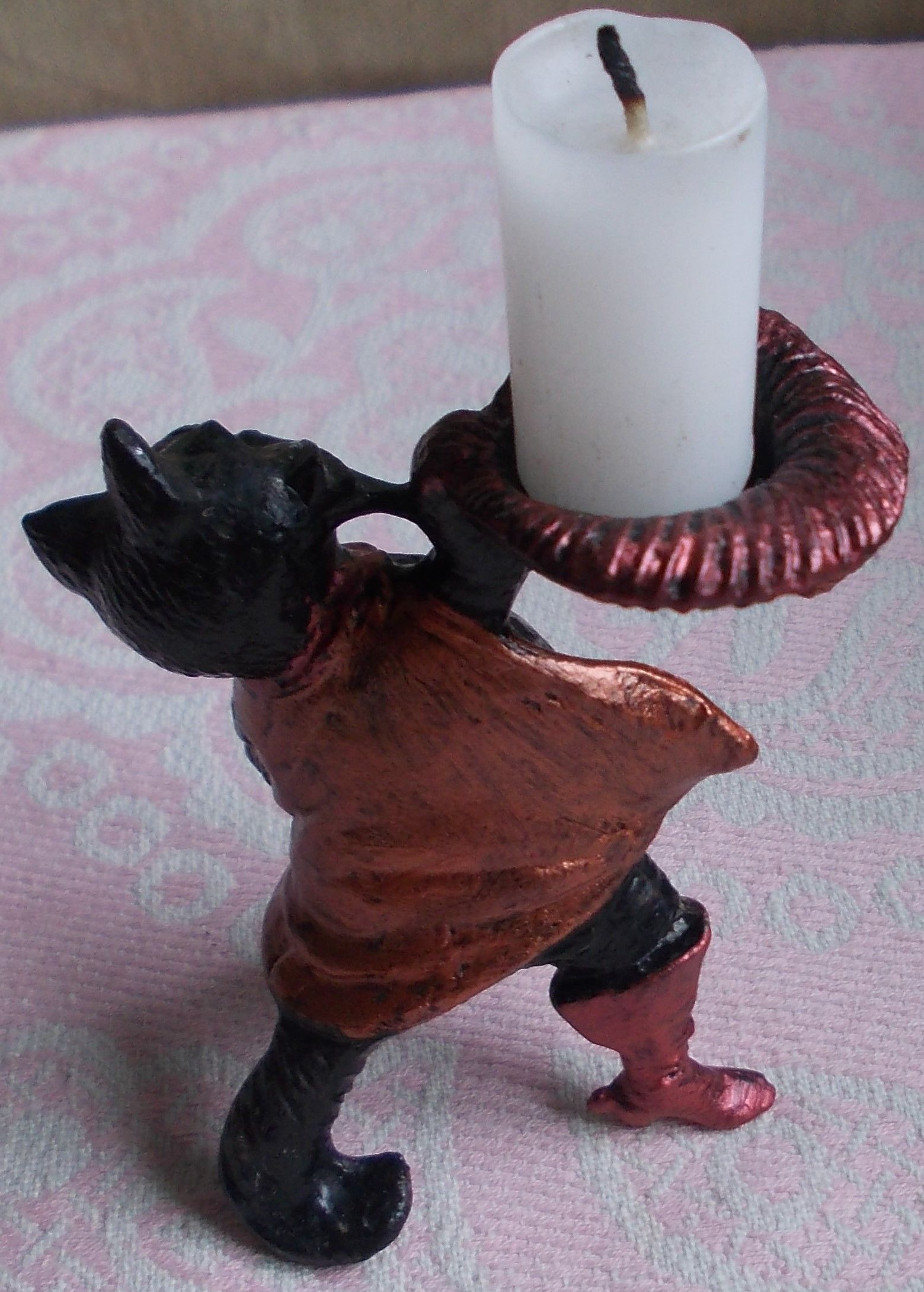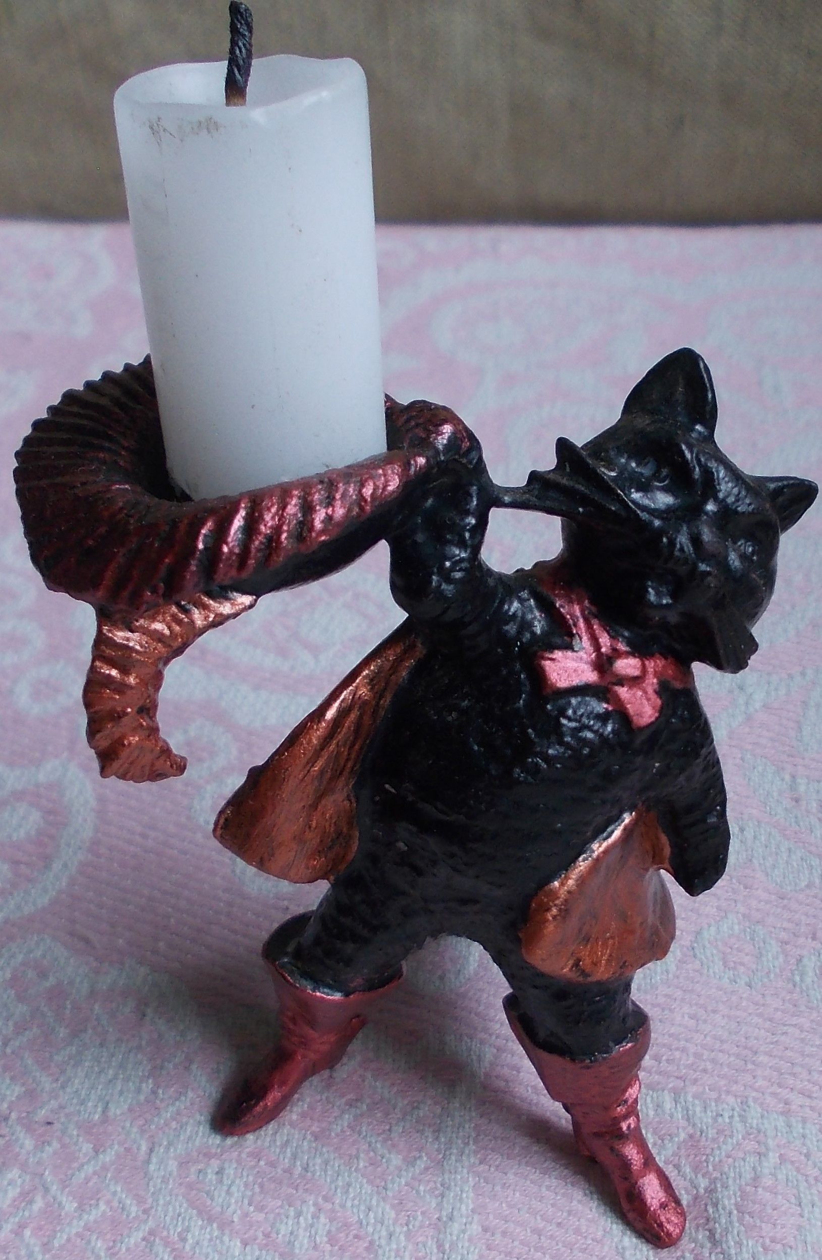 Вітаю шановних джентльменів, почав я колекціонувати свічники з березня 2023 року. Не обов"язково старовинні і дорогі. В приорітеті - свічники з фігурками казкових і фантастичних героїв, людей, звірів, рослин. Захоплення почалось з невеличкого свічника - Кіт у чоботях. Придбав на одному з аукціонів. Дуже подобається. Стоїть біля компа на робочому столі, "радує око і гріє душу". І - почалось... За місяць придбав зо два десятка тих, які сподобались і за помірну ціну. На даний момент - всі металеві: латунь-бронза, ЦАМ, алюміній оміднений. Деякі довелось помити, почистити, підреставрувати, підфарбувати так як мені подобається. Кожен свічник буде з невеличким огарком свічки, як у Кота в чоботях, щоб картина була закінчена.