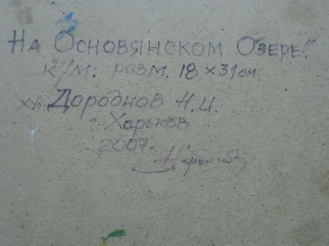Работа подарена автором летом 2007 года ко дню рождения. Где находится Основянское озеро в Харькове знают практически все. Кратко про автора работы: Дороднов Николай Иванович (род.1935 года. ) Учился в Харьковском художественном училище, закончил художественно-графическое отделение Краснодарского пединститута. Преподаватель Харьковской художественной школы им. И.Е. Репина. Его работы находятся в Харьковском и Киевском художественных музеях, а также в частных коллекциях США, Канады, Аргентины, Японии. Представитель Харьковской школы живописи, последователем Васильковского, Левченко, Ткаченко. Помимо лирических пейзажей, художник пишет жанровые картины: Ценность работ Н. И. Дороднова определяется не жанром, а, прежде всего, напряженностью мысли, значимостью художественного образа.